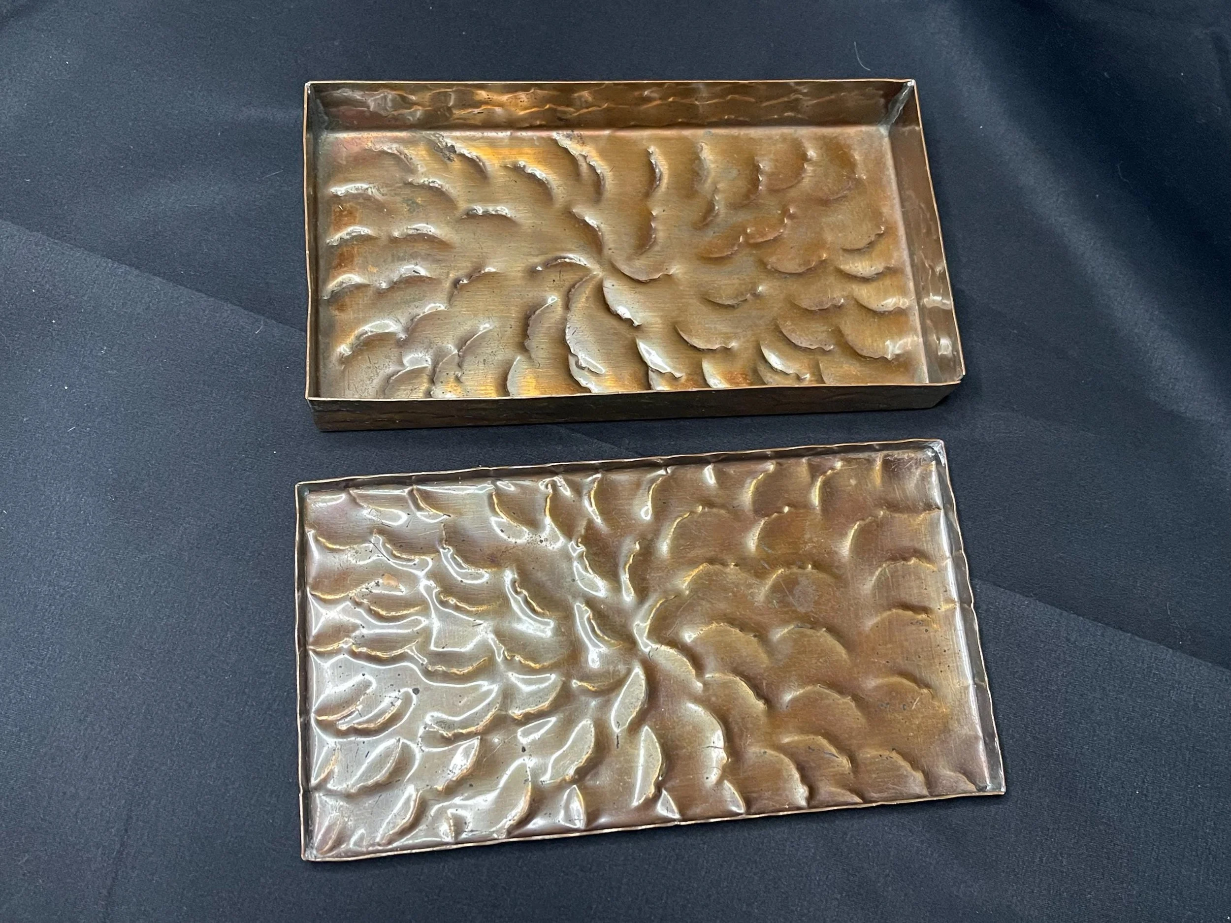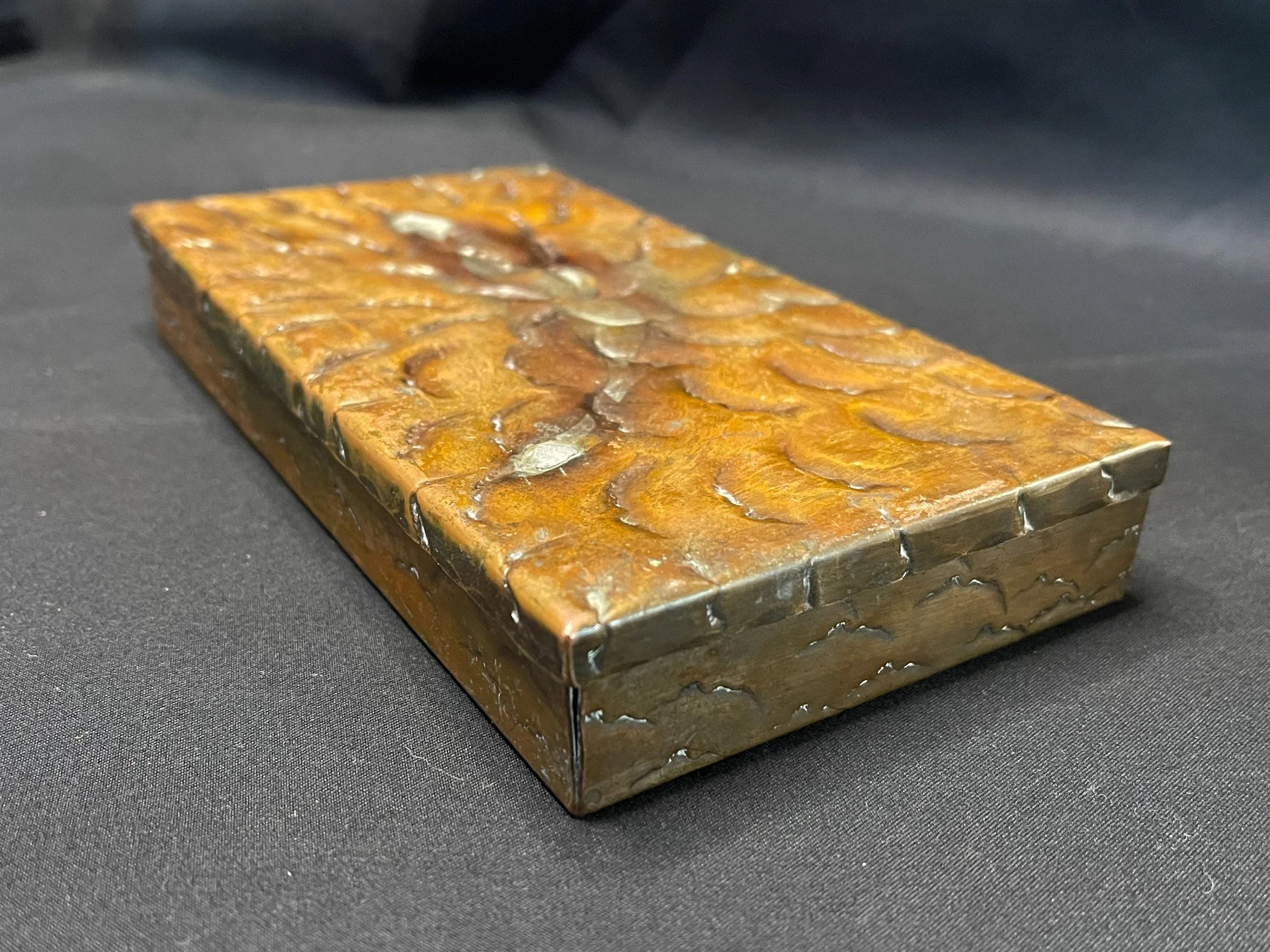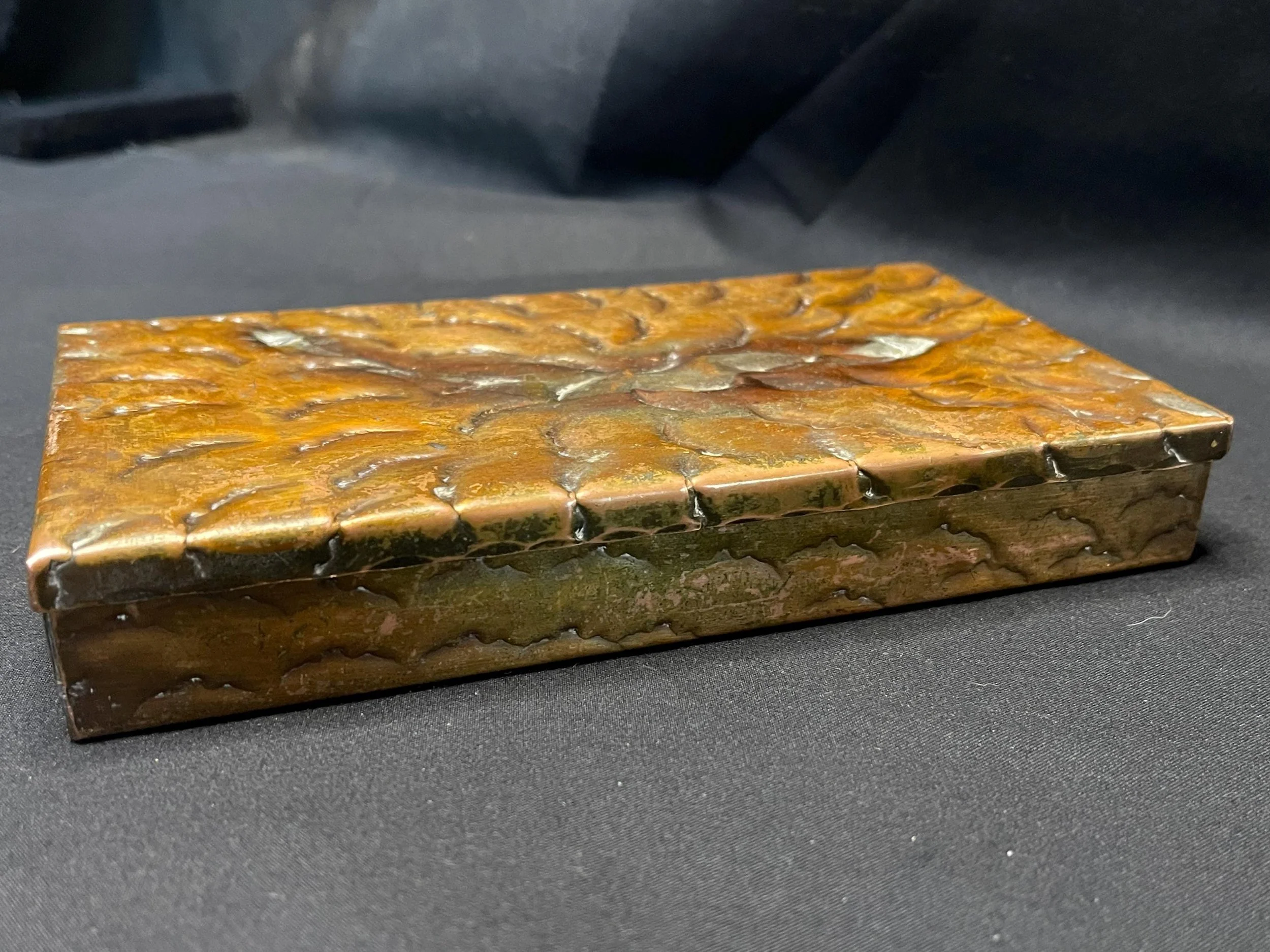 Antique hand-hammered solid copper box with a snug fitted lid. Rich, deep warm, multi-colored patina accented by graceful swirl details. Crafted using hammering techniques to create a raised, textured pattern of overlapping petals or waves. Displays charming age wear and a slightly opened corner as shown. Perfect for storing small trinkets while serving as an eye-catching, handmade decorative metalwork focal piece.