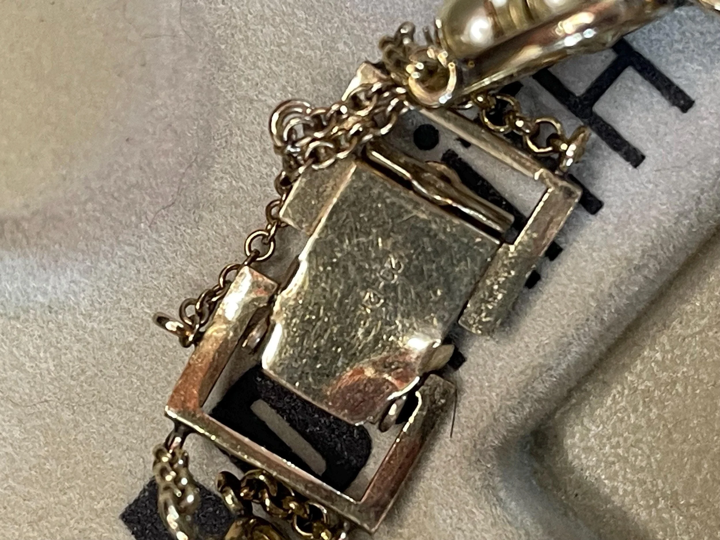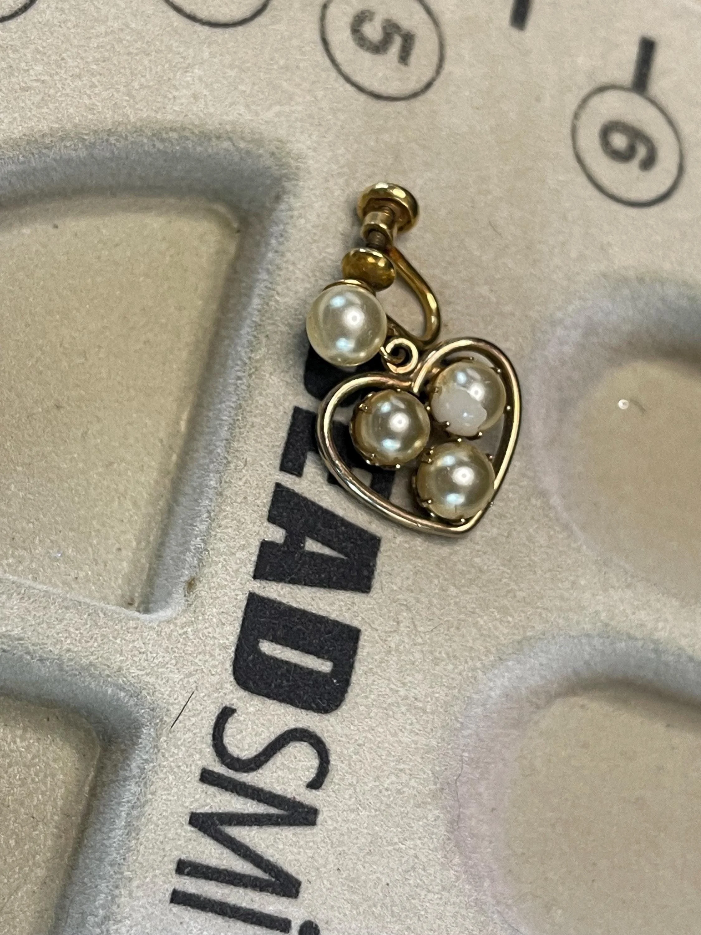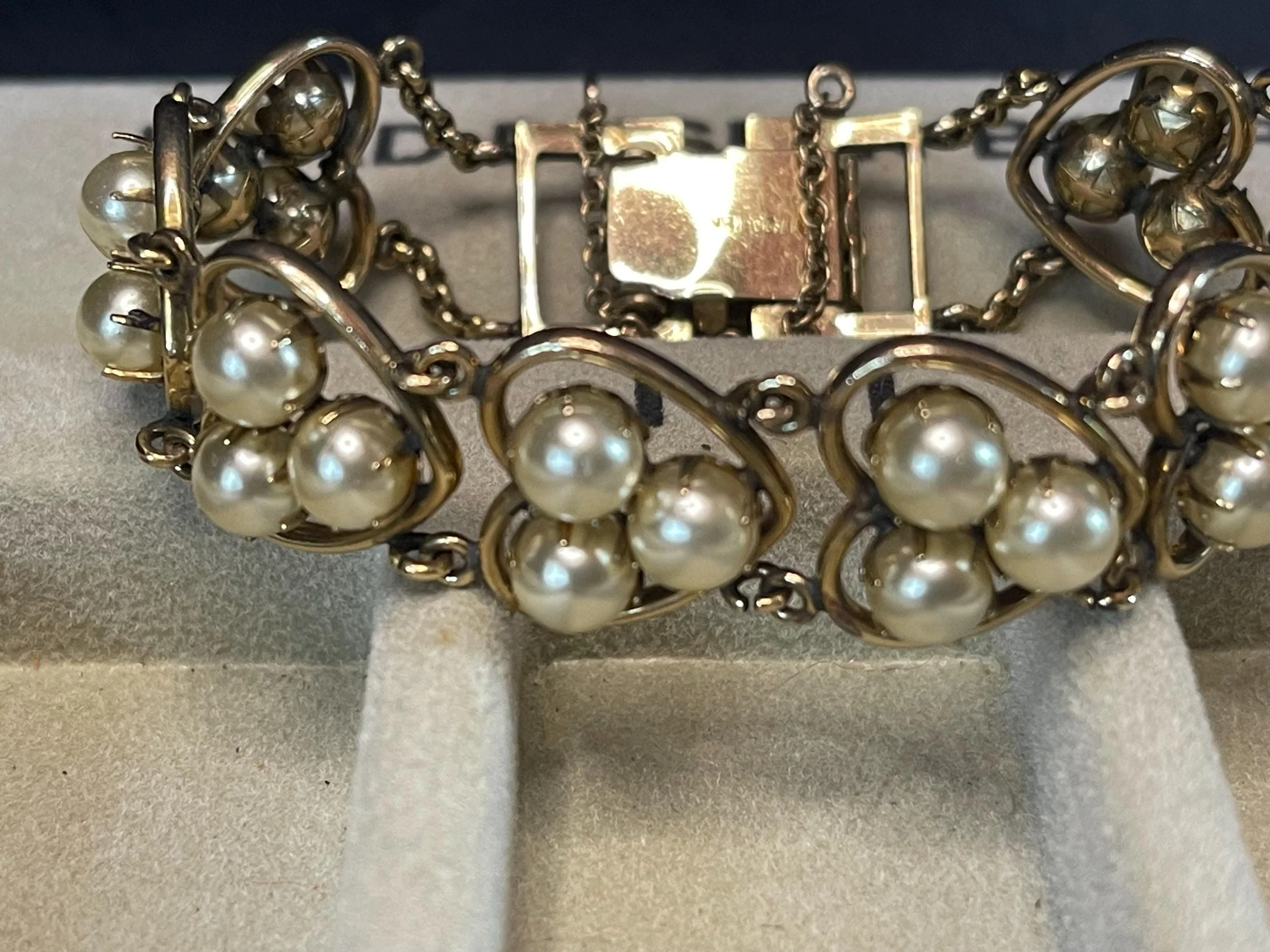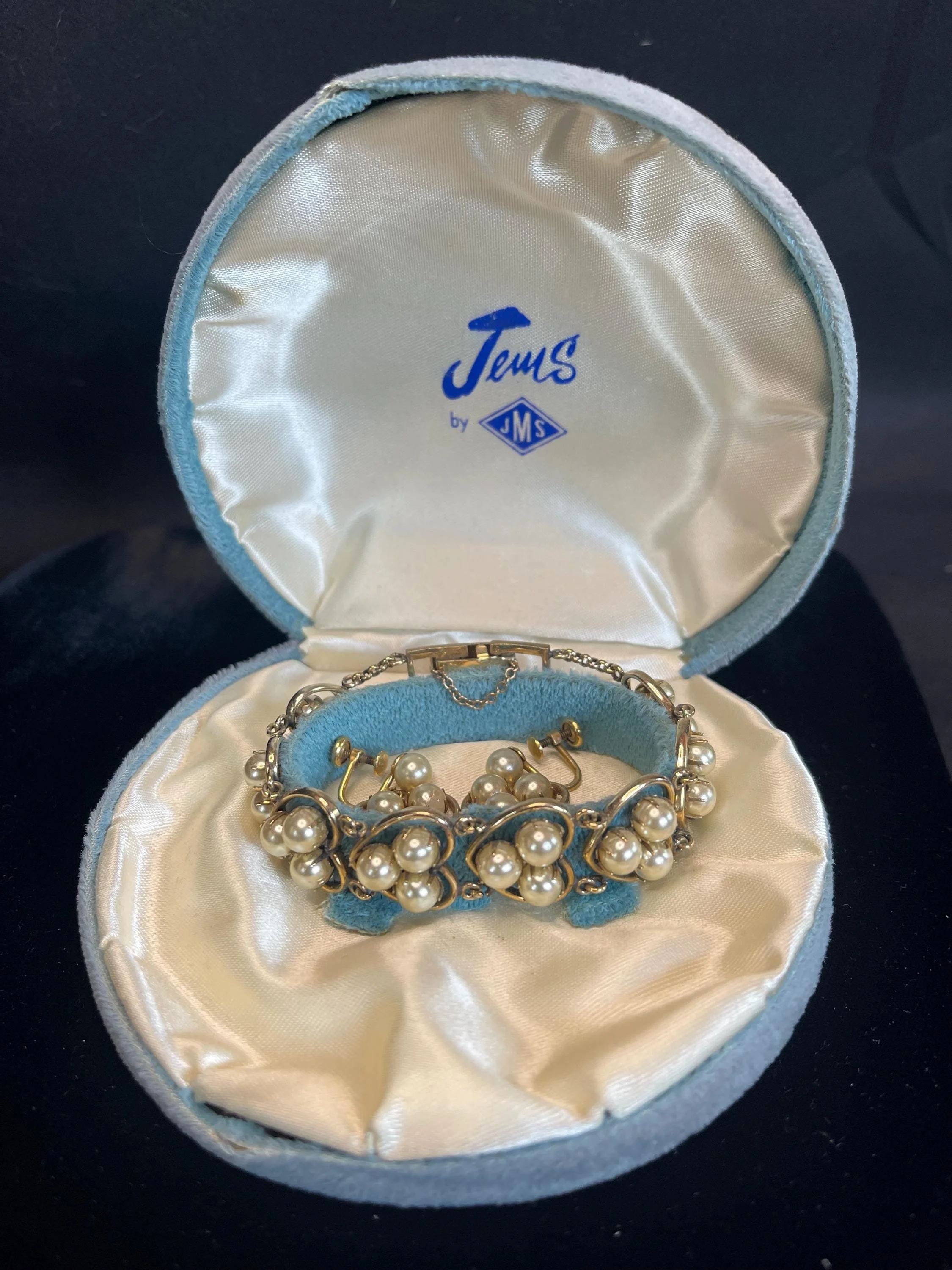 Fantastic set made by the JMS Jewelry Manufacturing Company c. 1950. In its original case, this charming ensemble includes a heart-shaped bracelet and screw-back earrings, each bearing the gold-filled mark of 1/20–12K, with the earrings also stamped JMS gold-filled. The set is in very good vintage condition — sturdy and well-made — featuring a solid bracelet clasp and safety chain for extra security. One earring shows a slight surface peel, but it is minor and does not distract from the set’s classic mid-century beauty (see images). A lovely addition to any vintage collection and perfectly wearable for many occasions.