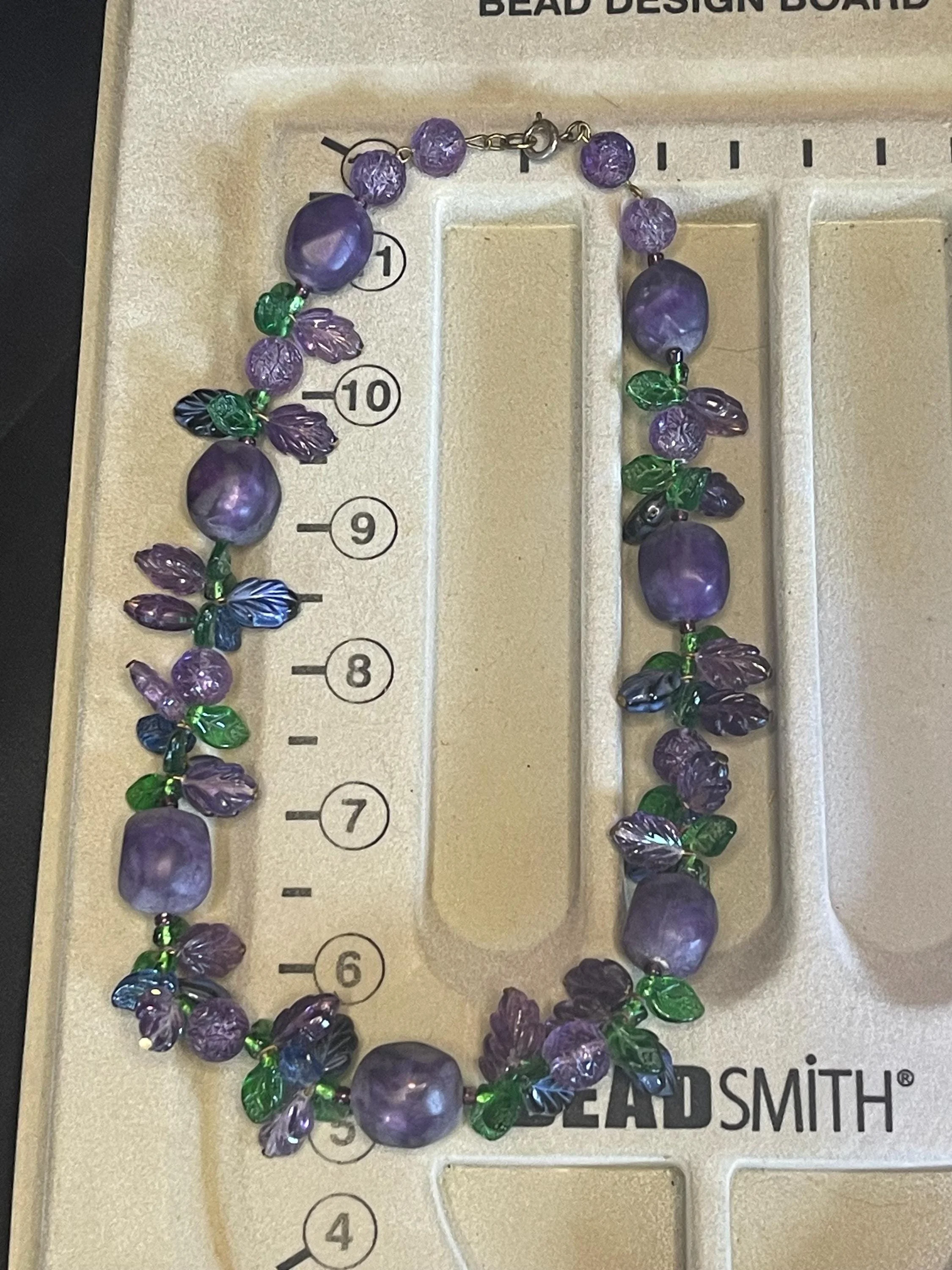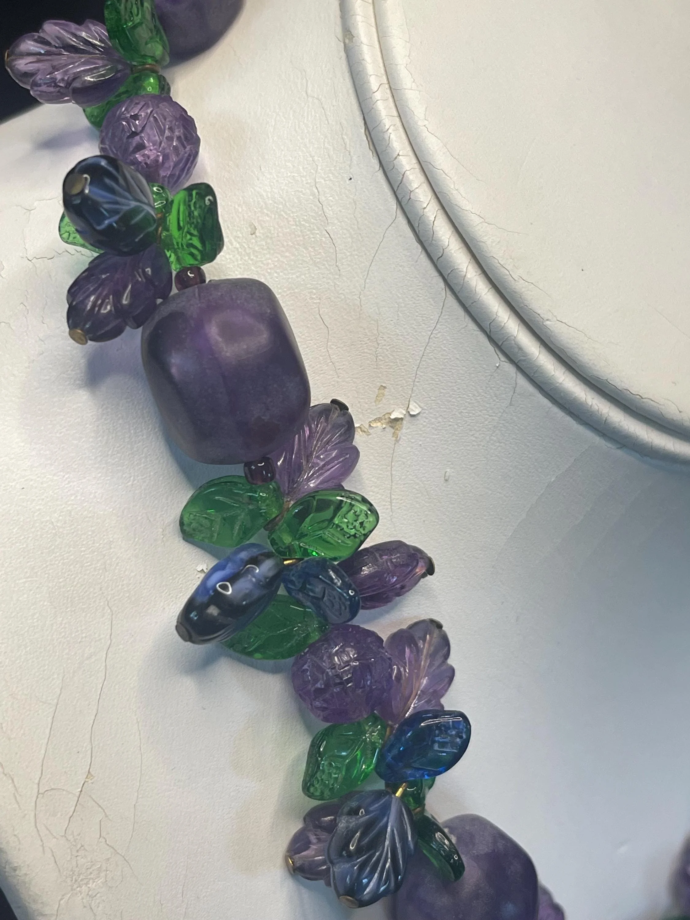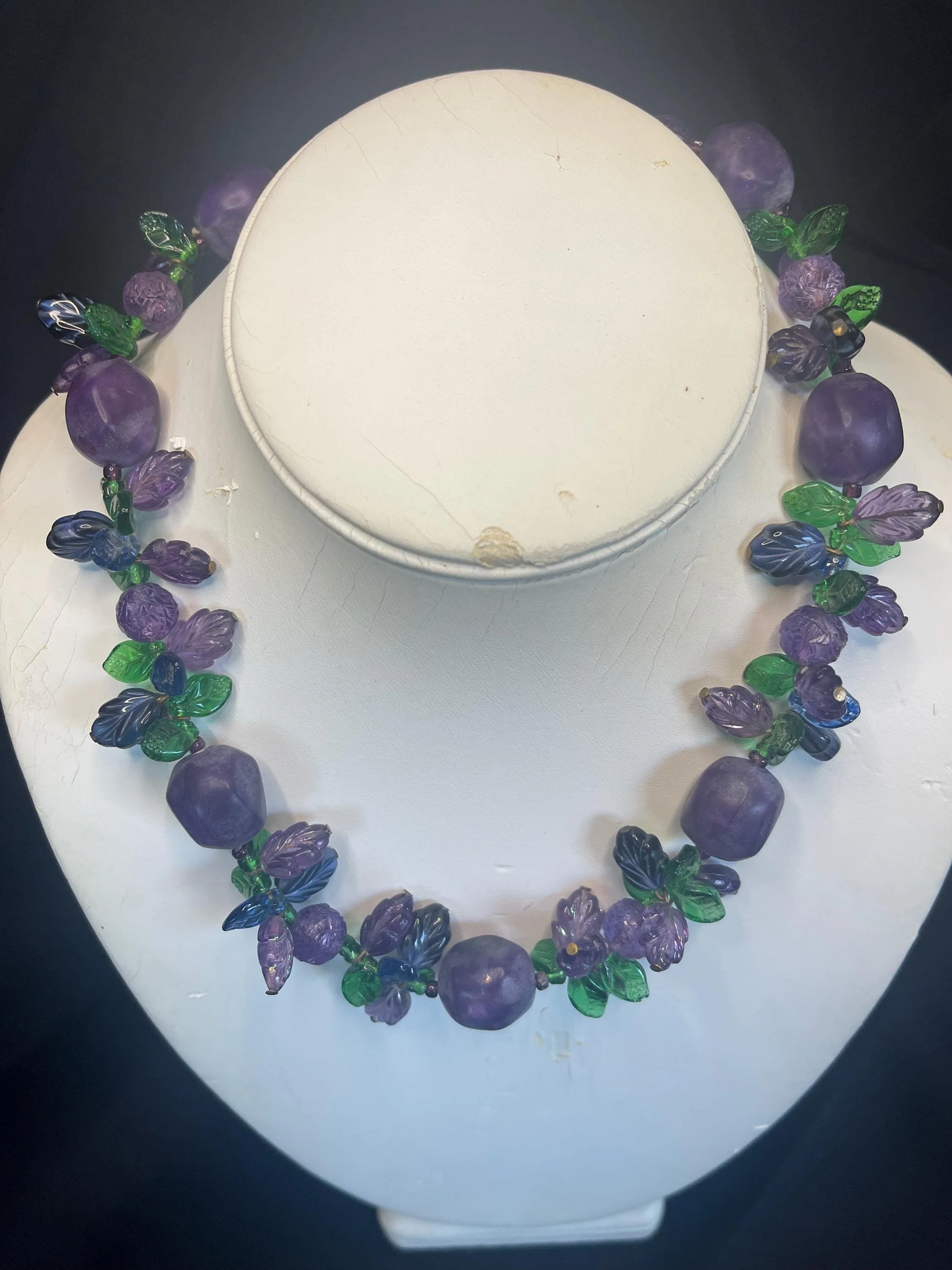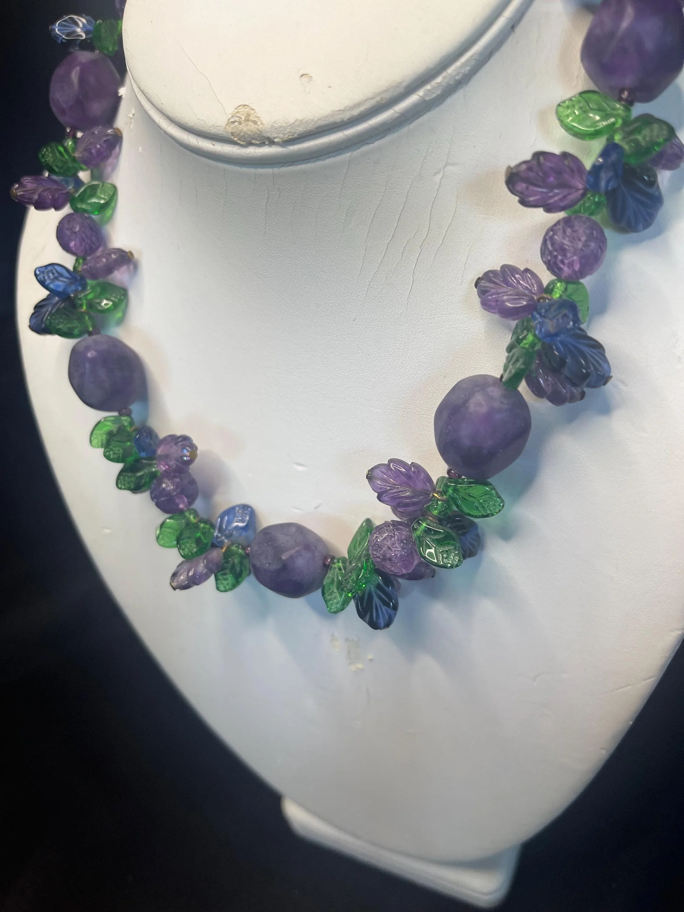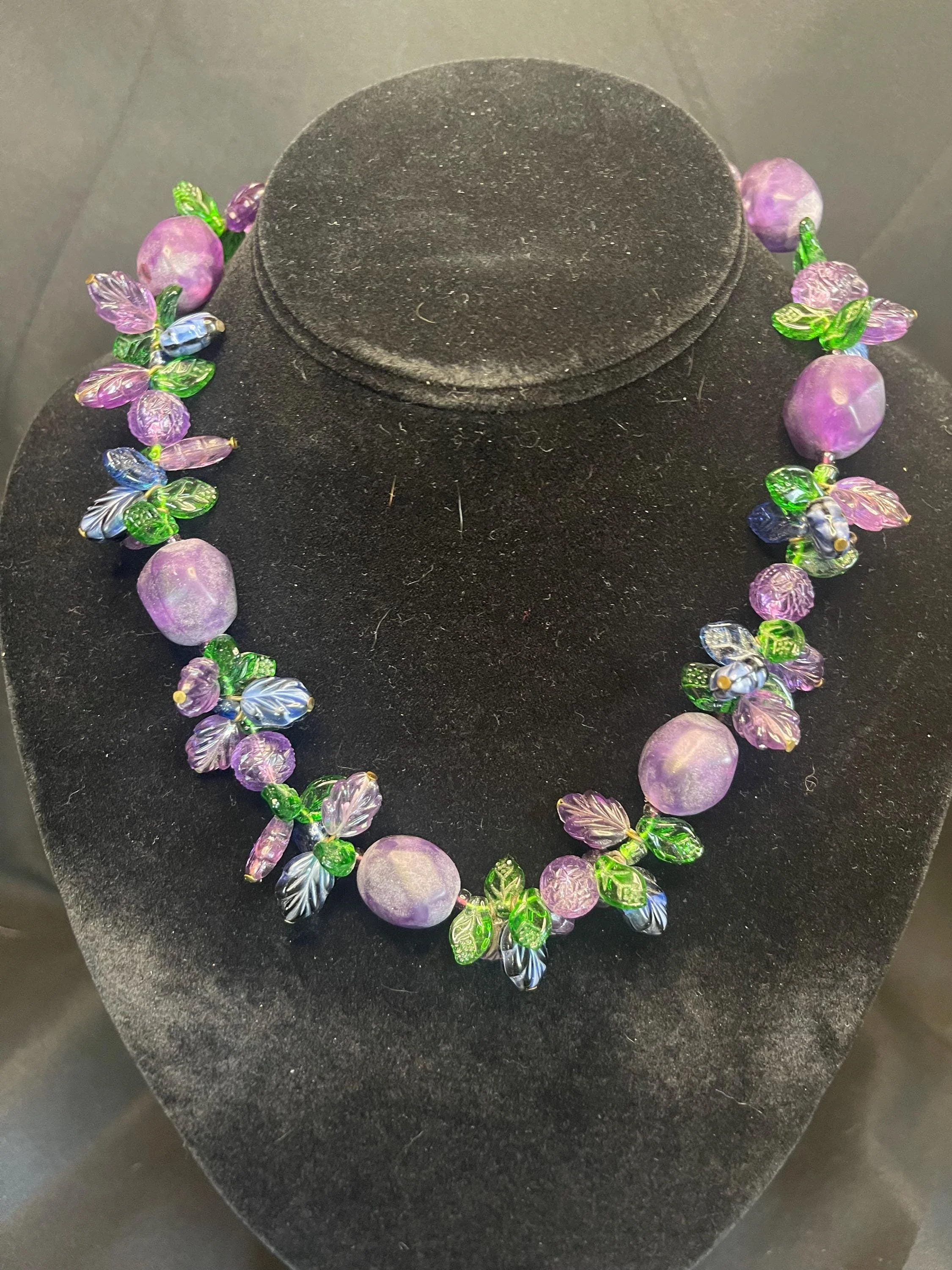 Inspiring grape fruit-salad Czech necklace featuring pressed glass floral and leaf designs in rich amethyst and green tones, accented by irregularly shaped translucent purple beads, each with subtle variations and not weighty. Held together with brass or brass-tone metal hardware for a warm, vintage look and a sturdy, handcrafted feel. A timeless classic of mid-century design, offering charismatic color, graceful movement, and enduring charm.