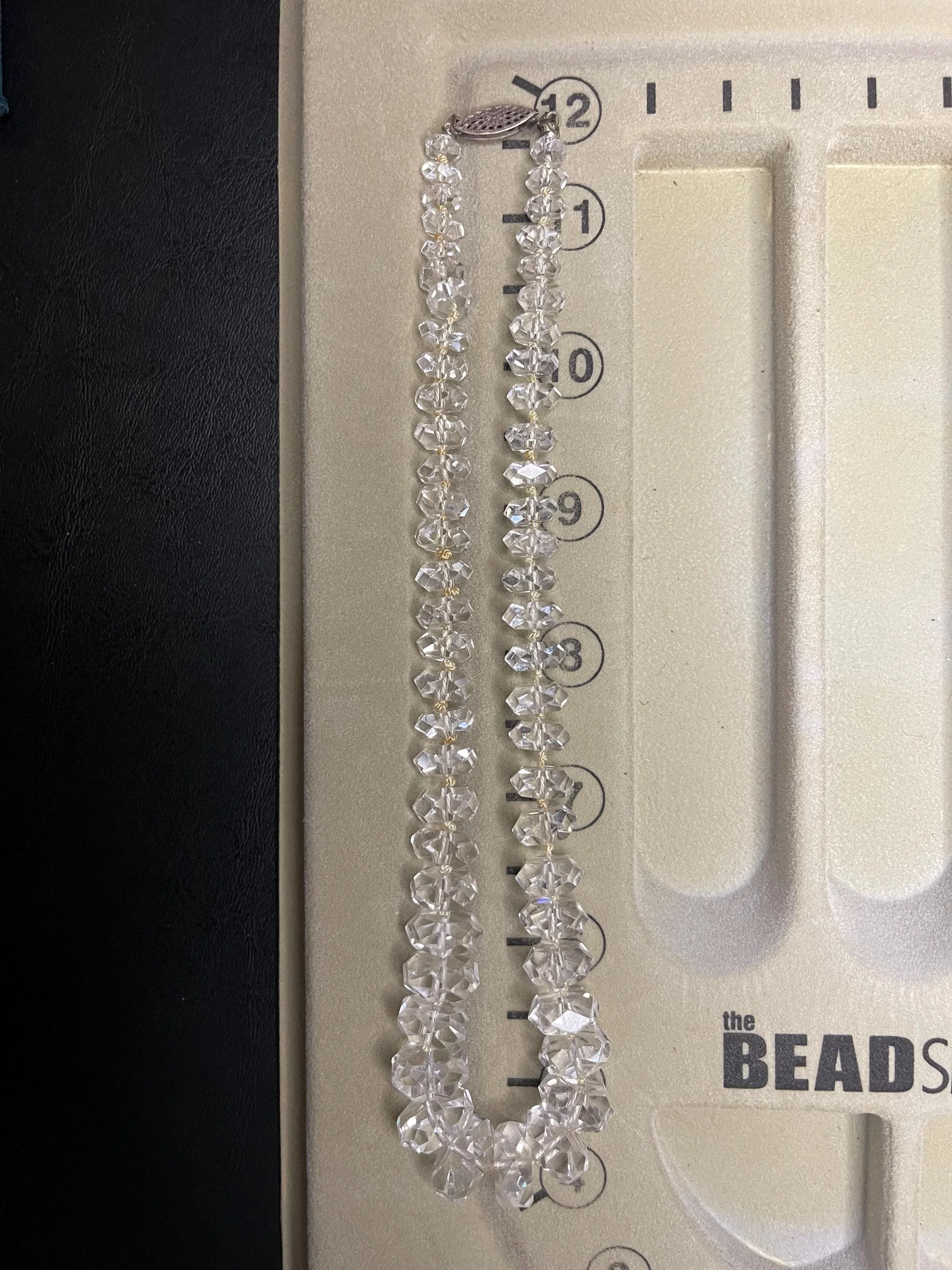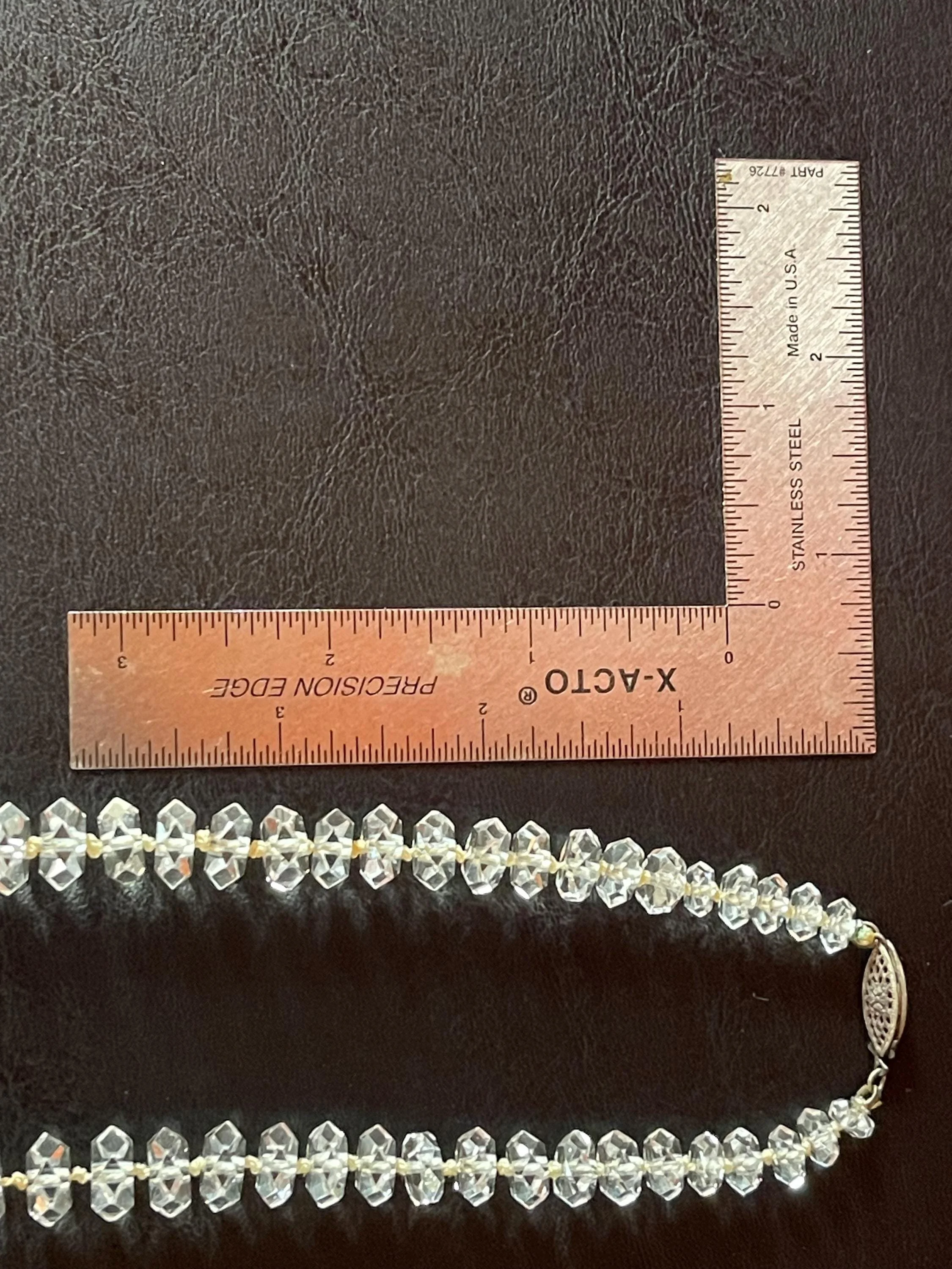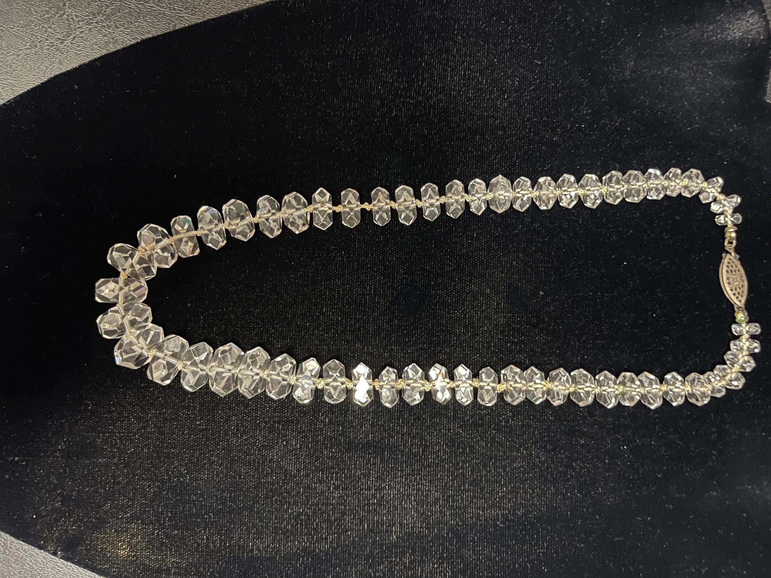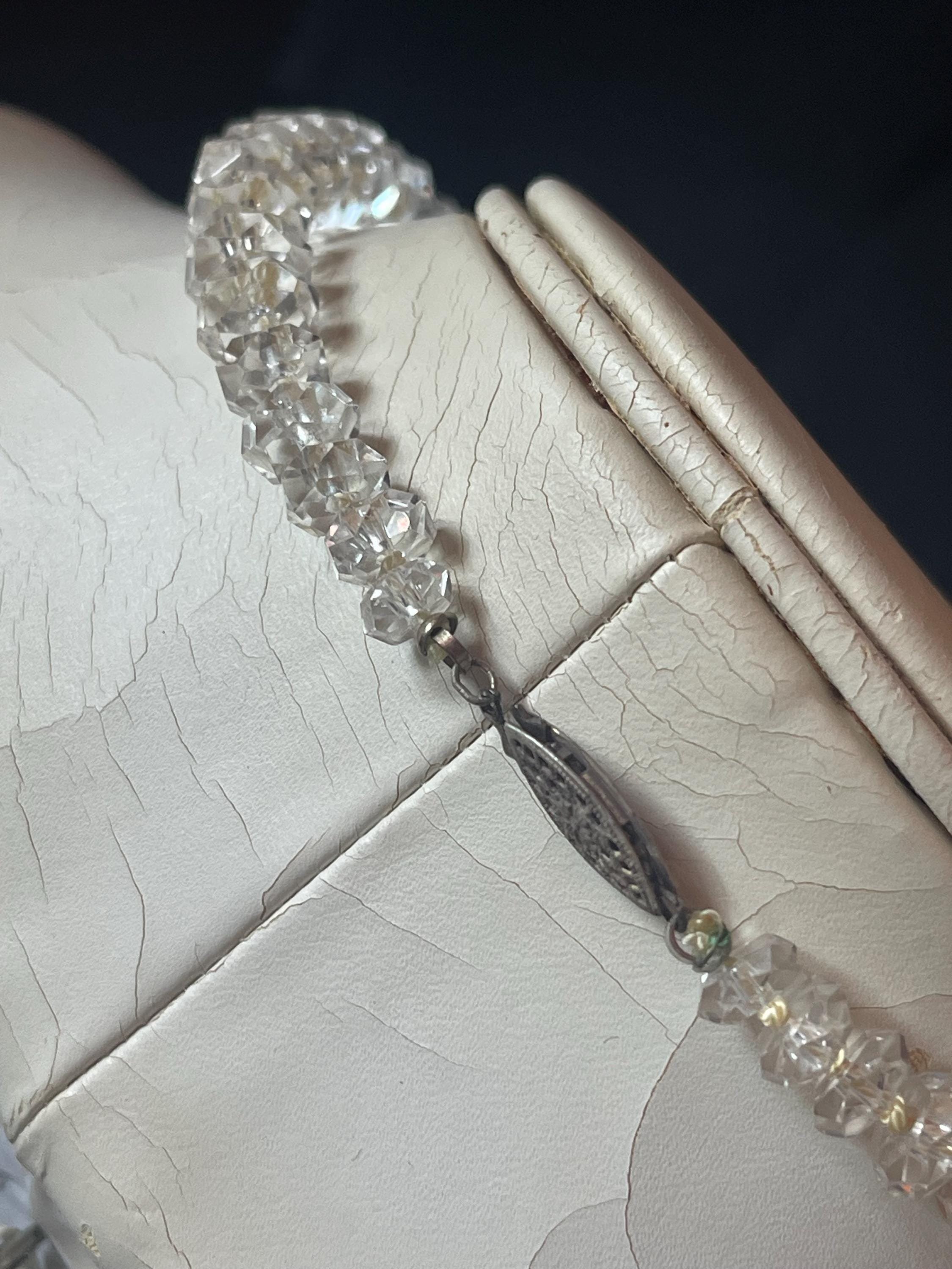 Lovely vintage rock crystal choker necklace to add to your collection: a striking statement piece that blends raw, old‑world charm with modern edge. Faceted rock crystal beads catch the light with icy brilliance, while the short, close‑fitting silhouette frames the throat for dramatic impact. Patinaed metal accents and a secure clasp nod to authentic vintage craftsmanship, giving the necklace character and history. Wear it alone to electrify a simple tee or layered with longer chains for a fearless, polished look—this choker turns every outfit into an intentional moment.